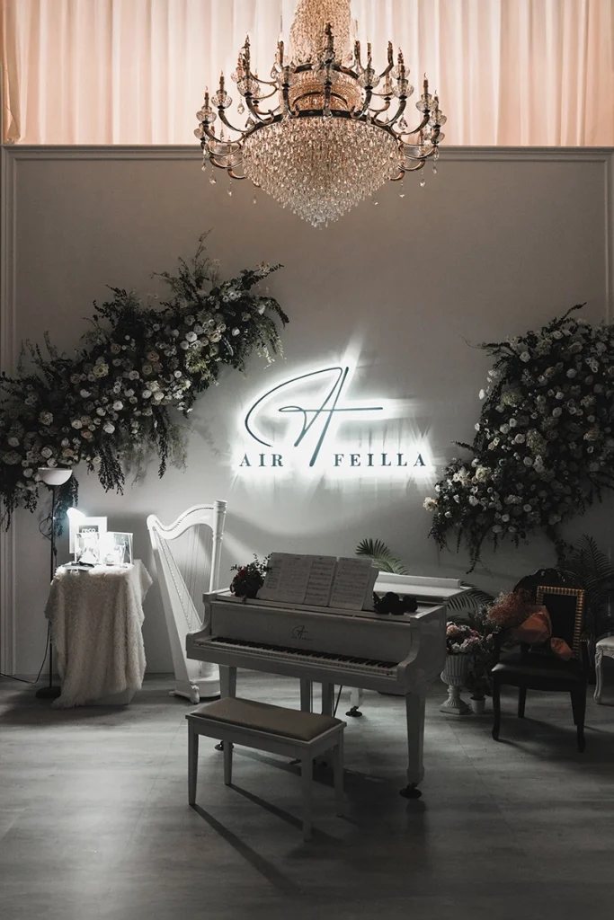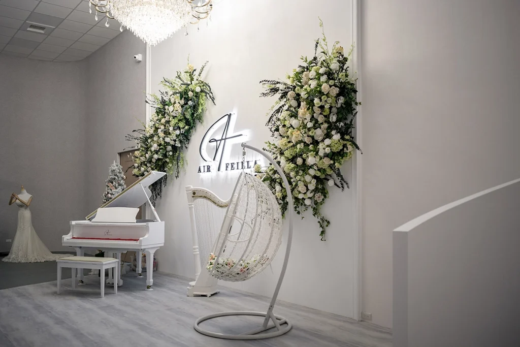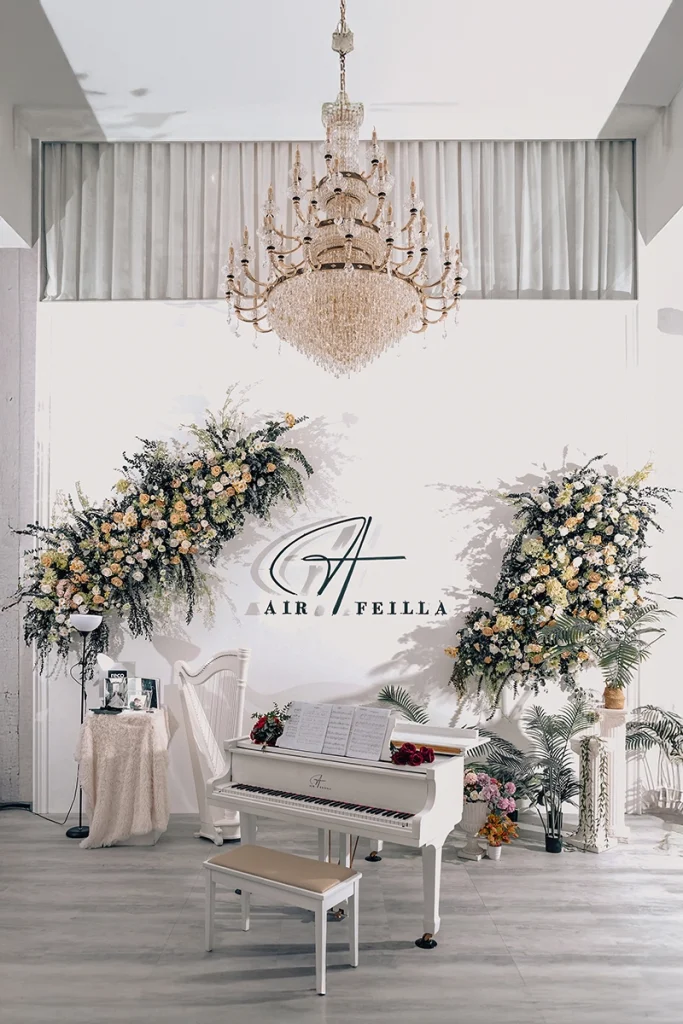 三腳白鋼琴/典雅植栽造景/九米白景無縫牆/純白旋轉樓梯/雪花綠樹造景